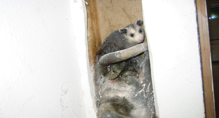 Dead animal carcass removal is specialty work. Sometimes the job is simple, such as a dead opossum in the yard, in which case we can simply wear our gloves and respirator mask, bag the carcass, and take it away for incineration. Sometimes this is more complex, such as when the dead animal is under a home crawlspace, under a porch or deck or shed. Or if the animal is larger, such as a dog or a deer. The most complex cases are dead animals inside the house. The animal may have died inside the attic, or down in the walls, or the duct work, or any other part of the architecture. You may have a bad smell in your home, and you're not even sure what's causing it. We've removed not just dead animals, but rotting food, bad mold, etc. We specialize in locating the source of the smell, and we very commonly cut a hole in the ceiling or wall to remove the animal. We remove every bit of the carcass, mop up the juices, vacuum the maggots, spray it and wipe it down with disinfectant, cleaner, and we repair the hole we cut. In some cases we use ozone machines to neutralize odor.